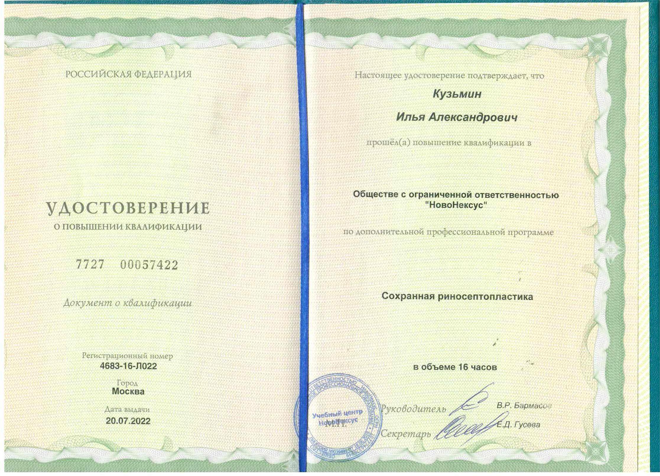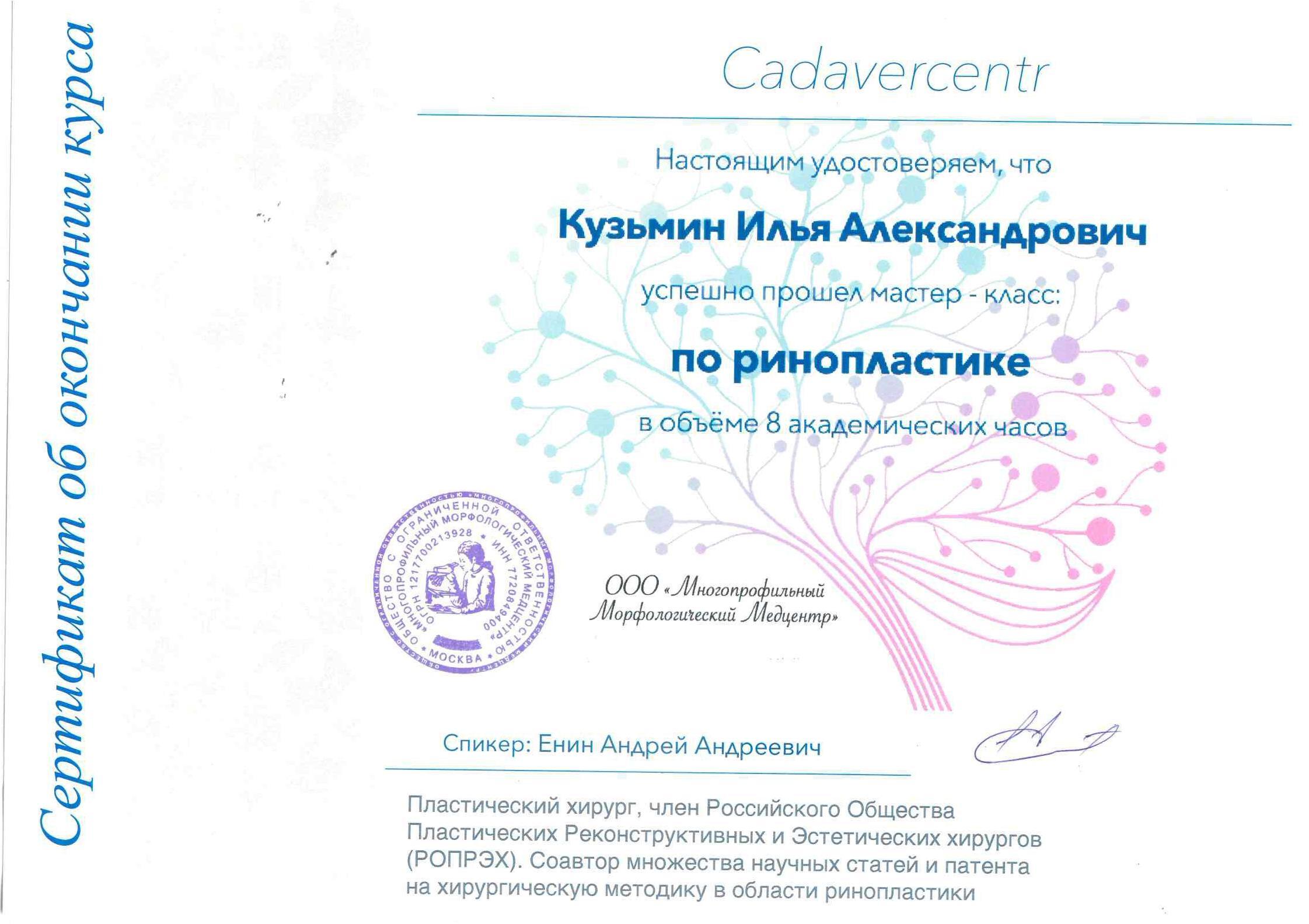 Стажировки и обучающие курсы в ведущих клиниках г. Москвы: «Современная функциональная ринохирургия» в 2016 и 2017 году под руководством Президента Российского общества ринологов, профессора, заведующего кафедрой ЛОР болезней МГМУ им. Сеченова А. С. Лопатина, стажировка на рабочем месте в ЦКБ по УДПРФ под руководством кандидата медицинских наук, члена Американской Академии Оториноларингологии Хирургии Головы и Шеи К. Э. Клименко.